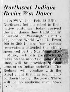 Lapwai, Ida - Northwest Indians robbed in their native costumes today revived the war dance they traditionally observed on Washington's birthday before World War II. From 200 to 300 Indians from various reservations attended the affair, sponsored by the Nez Perce.Music, which paradoxically, takes on the aspects of peace this time, will be providing by tom toms of an Indian orchestra. The Redman will vocalize with the tribal chant that has been handed down through the years. There will be no medicine man, however.